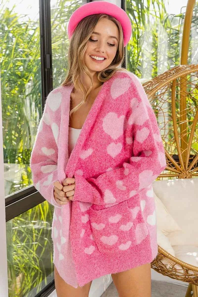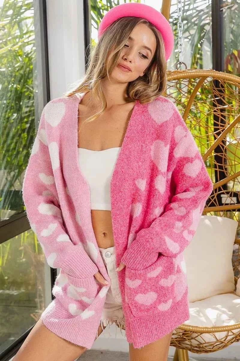 BiBi Heart Color Block V-Beck Knit Cardigan with Pockets