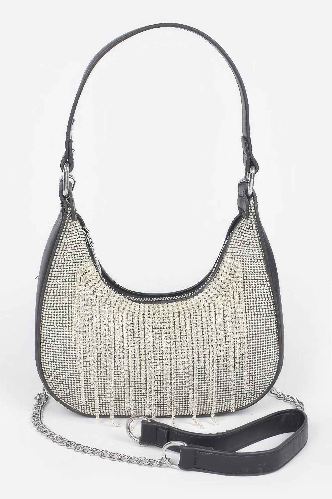 This hot fix rhinestone fringe hobo bag delivers bold movement and striking detail. Designed with shimmering stones and fringe accents, it creates eye-catching texture. The hobo silhouette offers a relaxed yet stylish shape. Spacious enough for essentials, it balances fashion with functionality. The fringe detailing adds dynamic motion with every step. Durable materials ensure long-lasting wear. This bag is a statement accessory made to stand out.