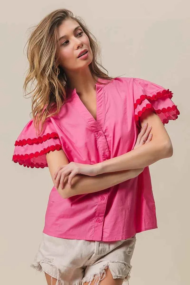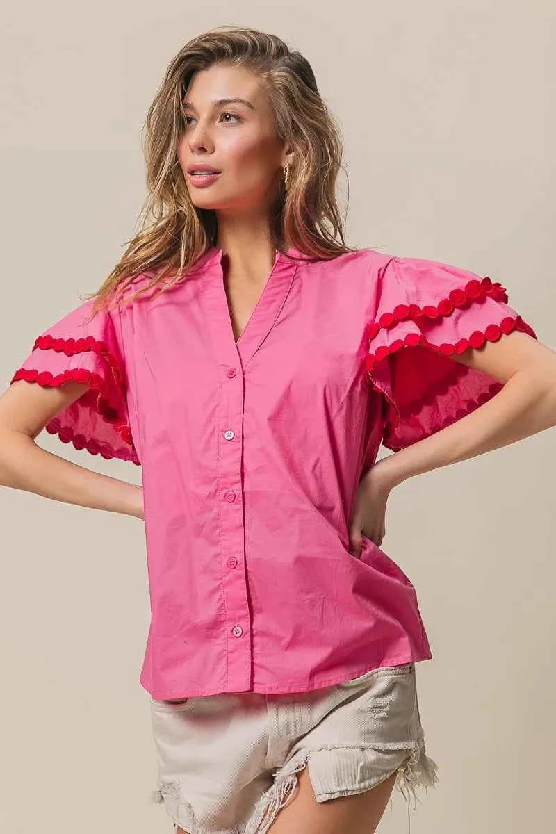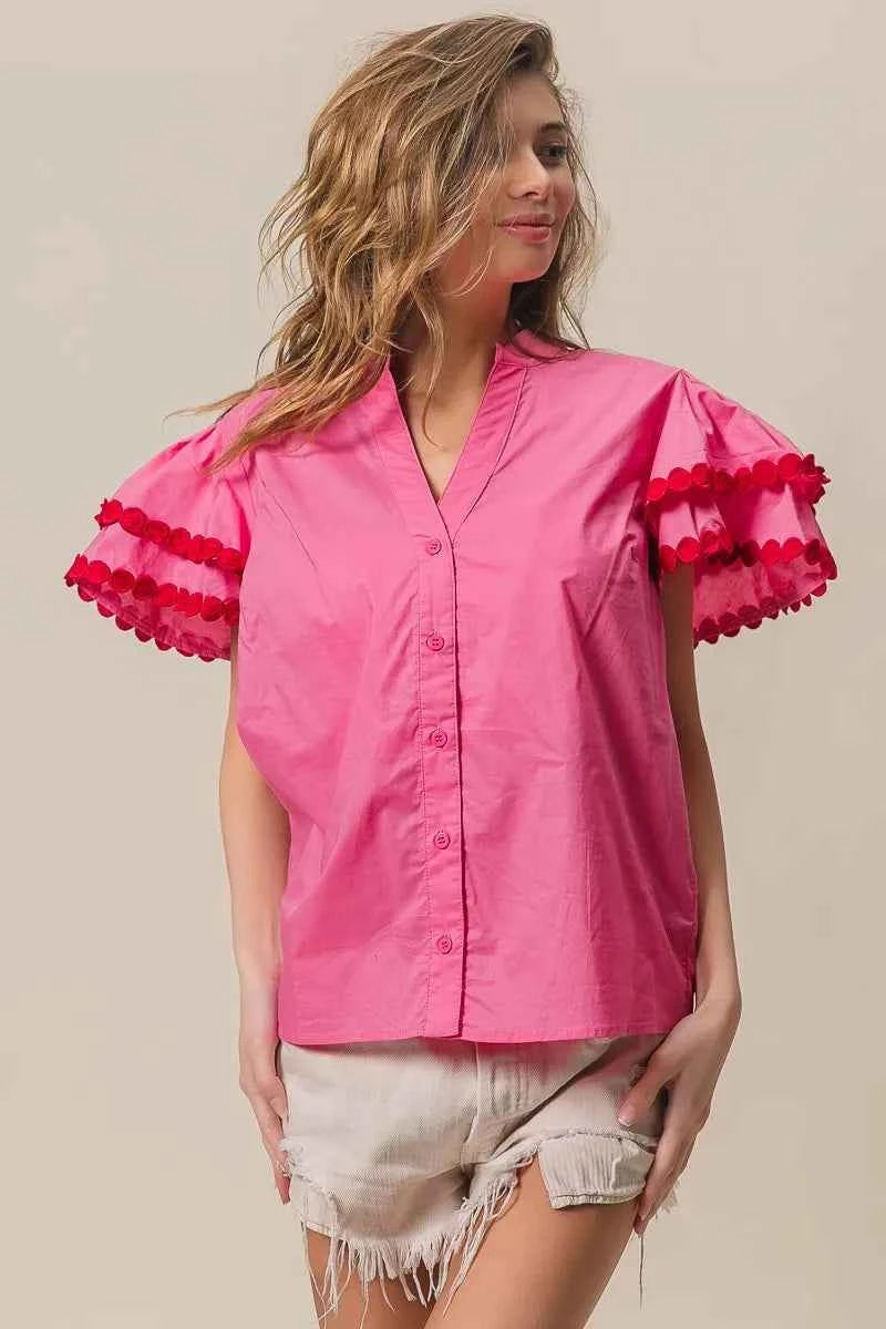 This stunning pink button-up blouse features eye-catching ruffle sleeves that add a playful feminine touch to any outfit. Made from comfortable cotton blend fabric, this shirt offers both style and comfort for everyday wear. The classic collar and button-down front provide a timeless silhouette, while the unique tiered ruffle sleeves create a fashion statement piece. Perfect for casual outings, work settings, or weekend activities. The vibrant pink color adds a pop of brightness to your wardrobe, and the relaxed fit ensures comfortable all-day wear. Easy to care for and versatile enough to pair with jeans, skirts, or dress pants.