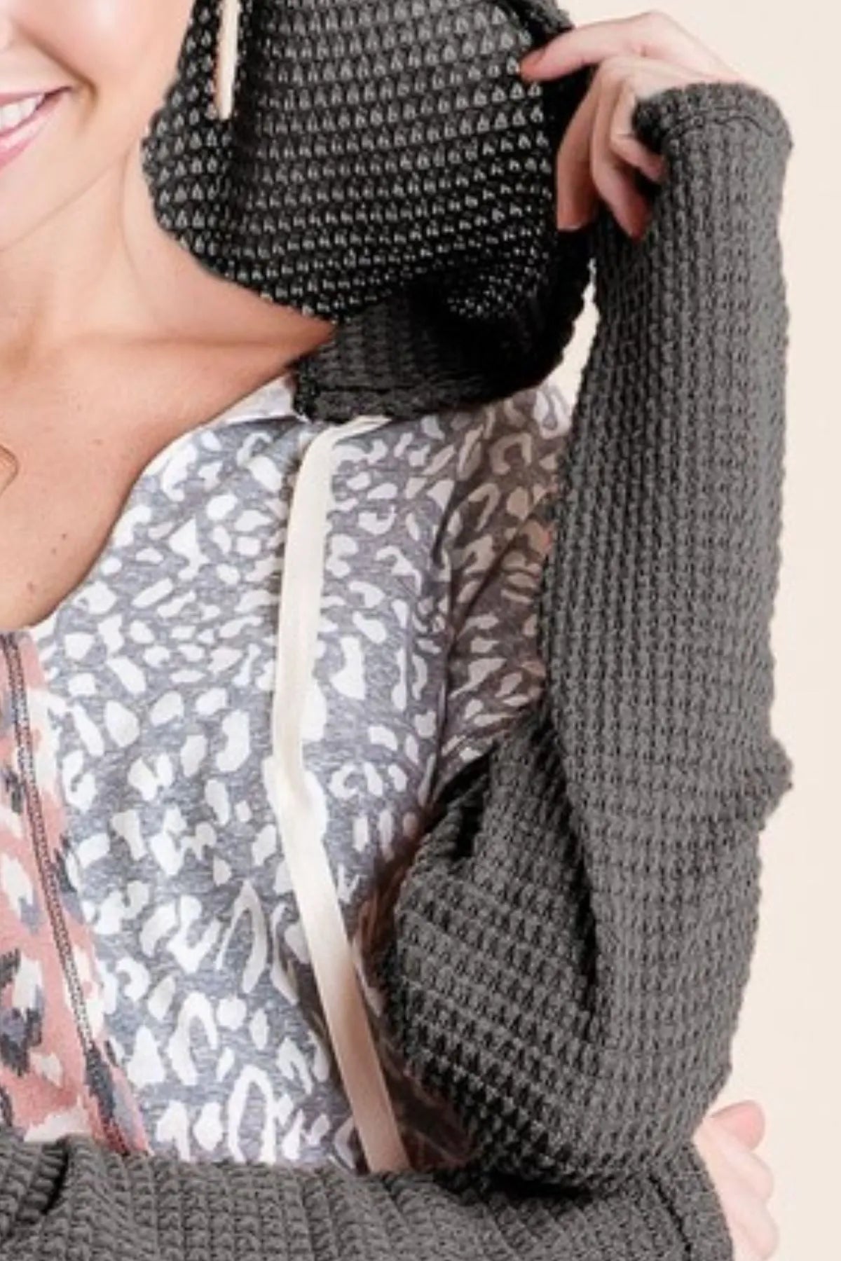 Stay cozy and stylish in this Popcorn Waffle Knit Hoodie with Print Block Front. The textured waffle knit fabric adds a unique touch to this classic hoodie style. The print block front provides a trendy and eye-catching design element. Perfect for a casual day out or lounging at home, this hoodie is sure to become a favorite in your wardrobe.